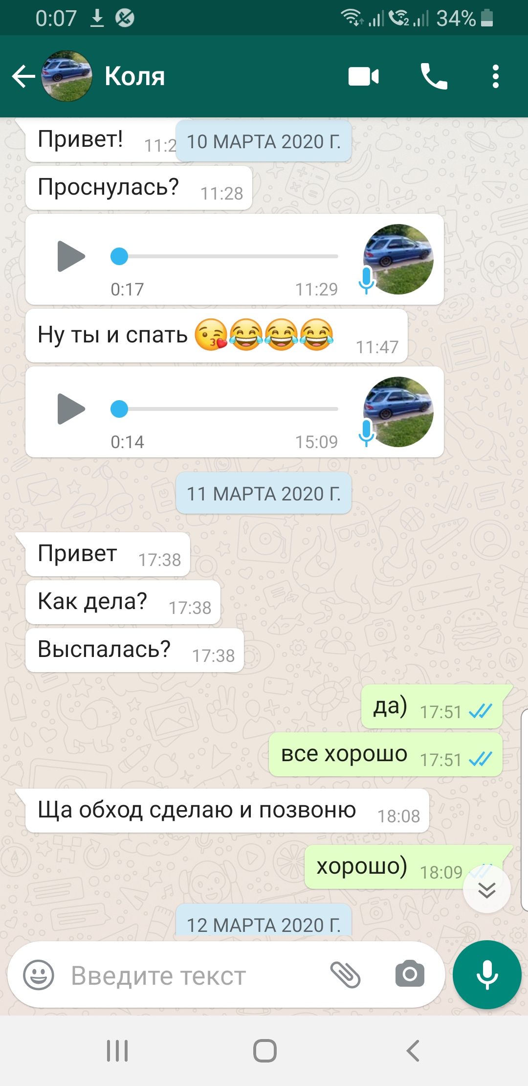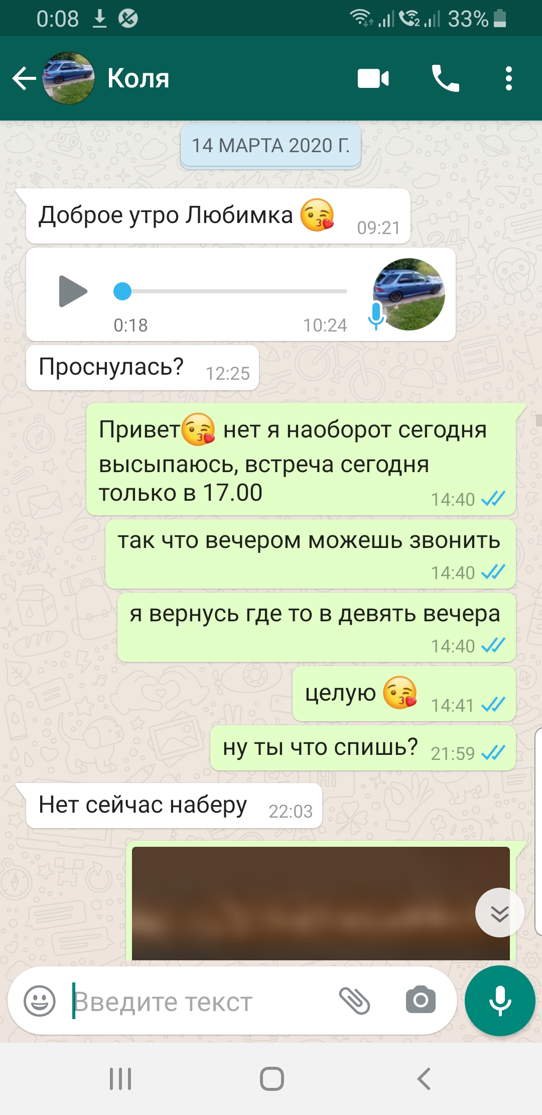 И дальше Коля стал немного наезжать на меня, мол у нас с тобой Света такие замечательные отношения, зачем ты лезешь и капаешь все это, я со своей бывшей можно сказать из-за этого и разошелся, она везде лазила и капала. Потом он начал называть меня: “Зайка, моя” и успокаивать.