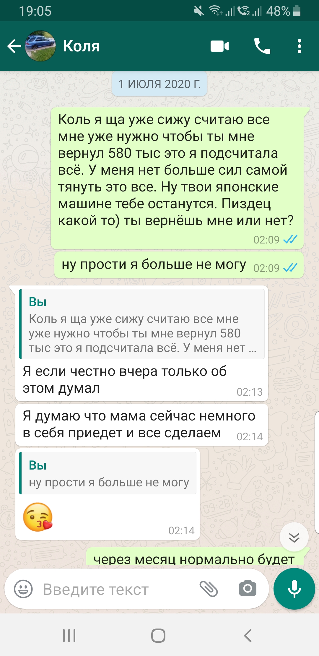 Ниже небольшая часть разговоров, которые у нас были на регулярной основе. Основная суть всех разговоров это обещания Николая вернуть деньги тогда то или тогда то и не в итоге не возвращает. Пусть люди знают, что это за человек и сами решают иметь с ним дело или нет.