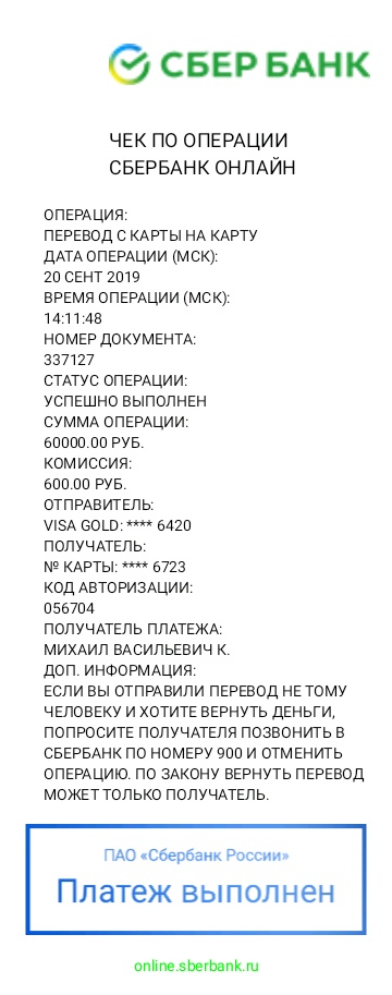 | Это на страховку и другие мелочи | 20 000 рублей (на карту Екатерине Милючихиной) |