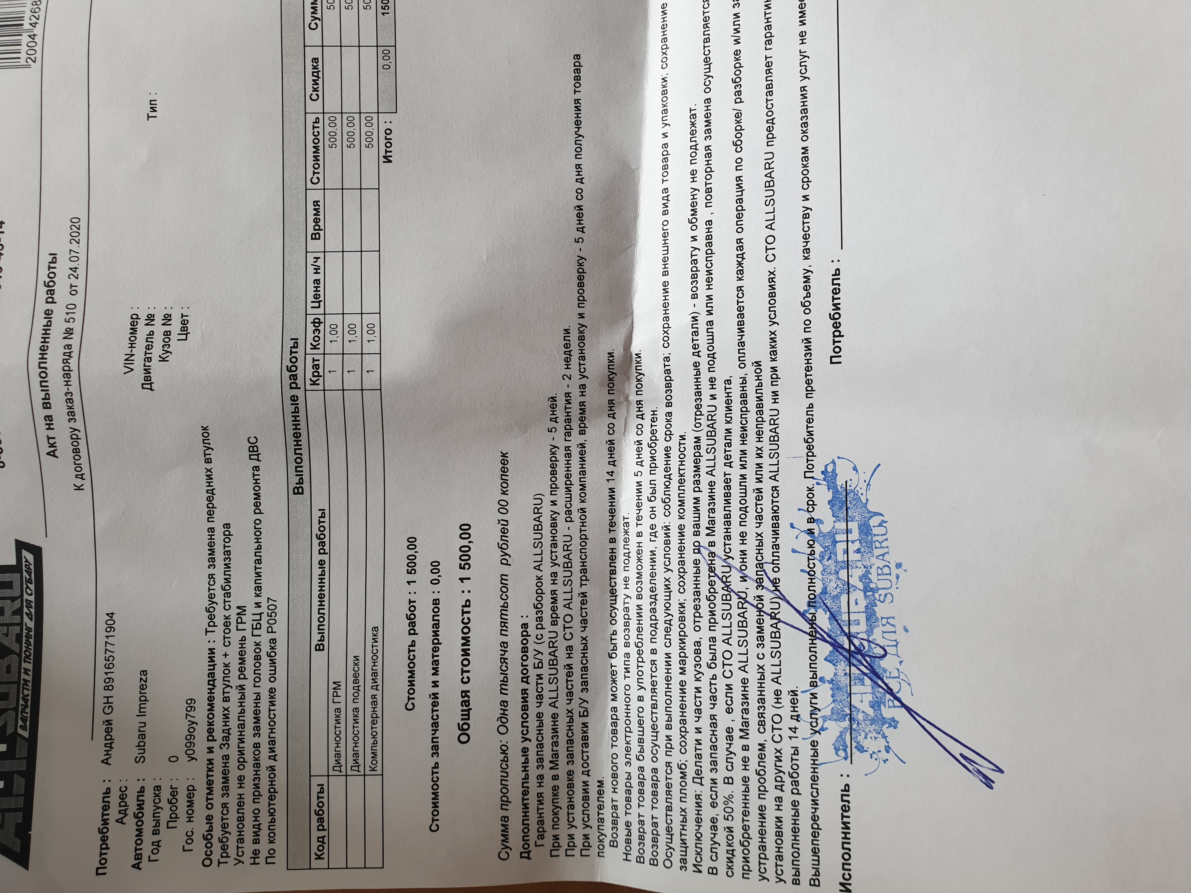 | Масло в коробку. Когда я выслала Николаю видео с тем, как мигала панель у машины, он сказал, что нужно заменить масло в коробке и все исправиться, я ему сказала, что ребята из сервиса говорят, что это ингибитор, его надо менять. Николай сказал, что отлично знает машины Субару и уверен, что дело в масле. В итоге масло поменяли, ничего не помогло. Покупка масла. | 6800 рублей |